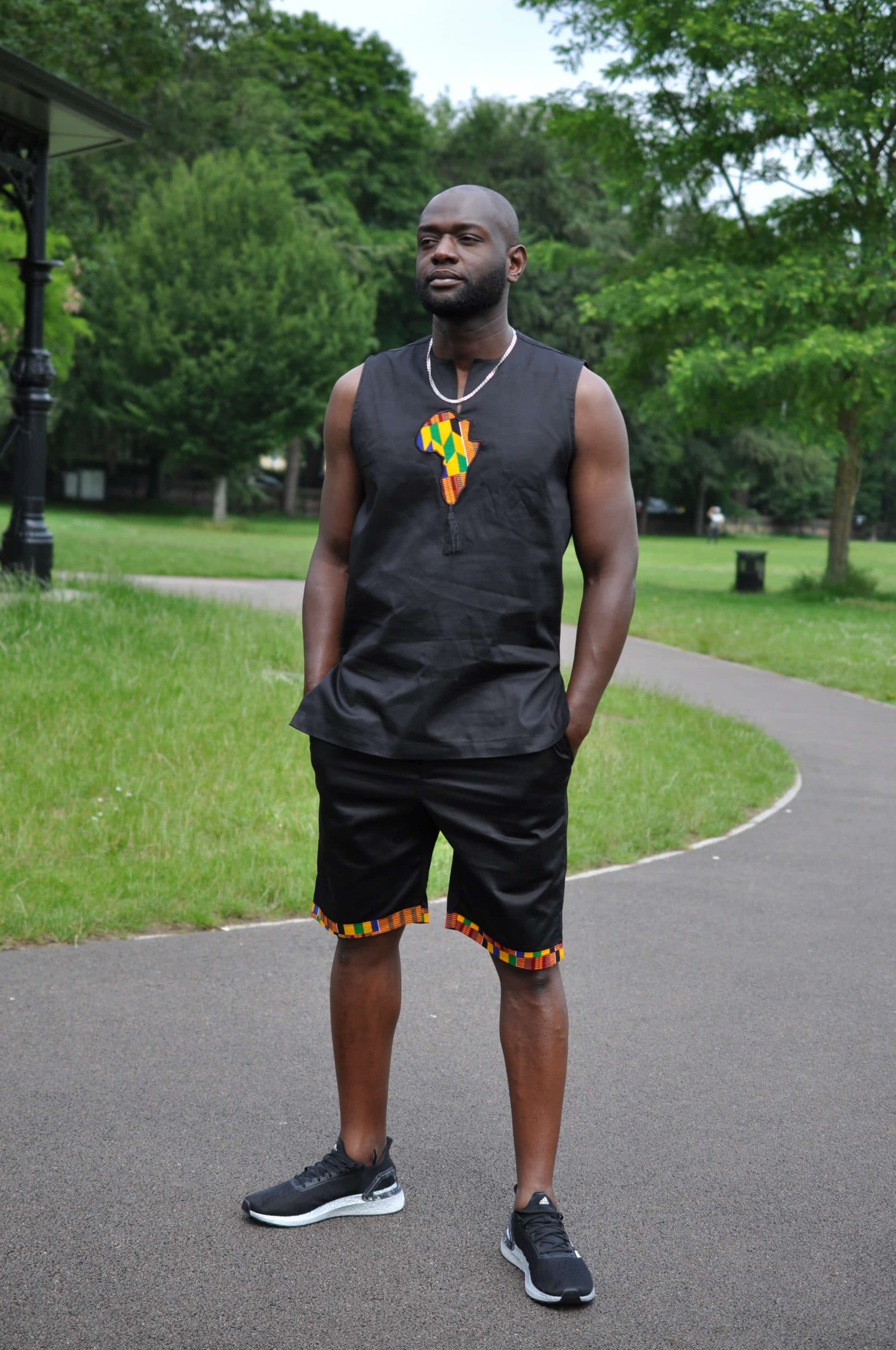 Keep your style game on point with this Black & African Print Trim Short Pants Matching Set / Co-ord . Unique and eye-catching, this African short pants set is on fire! This black 2 piece set has a map of Africa and hem and pocket detail in Kente African print which finishes the look to perfection. Great for festivals, parties or any summer event. This African-inspired design includes a sleeveless tank or vest top and matching shorts. Free UK Shipping. Worldwide Shipping available.