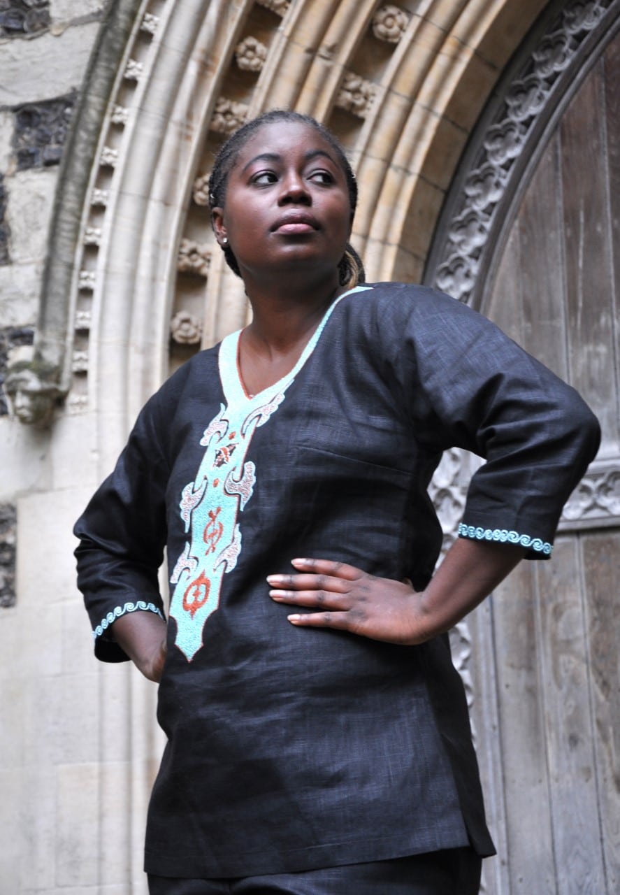 This Black and Turquoise Ladies Linen Trouser Suit for women is perfect for traditional events and special occasions. With a classic design, this ladies trouser suit or pantsuit has 3/4 sleeves and lovely African embroidery on the front, neckline, back and sleeves to add elegance. Also designed for comfort, this suit allows for movement in the arms and has comfy roomy trousers. Pair with some beautiful wooden earrings and bracelets to finish the look. With a loose fit, this linen suit fits comfortably and allows for air circulation in hotter temperatures.