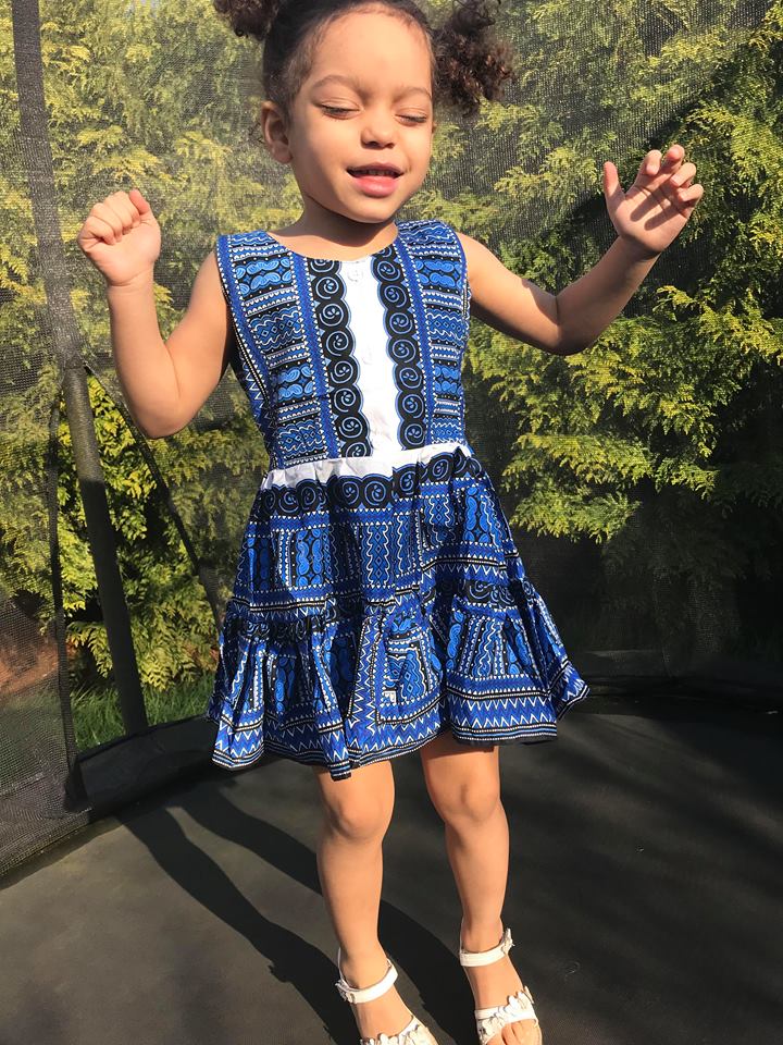 An absolutely adorable blue & white African dashiki summer party dress for even the most active little girls (3 to 4 years). Very versatile, you can dress it up for occasions or wear it every day. Very comfortable to wear and available in different colours to truly express your little princess’s character. Perfect as an every day summer dress or party dress!