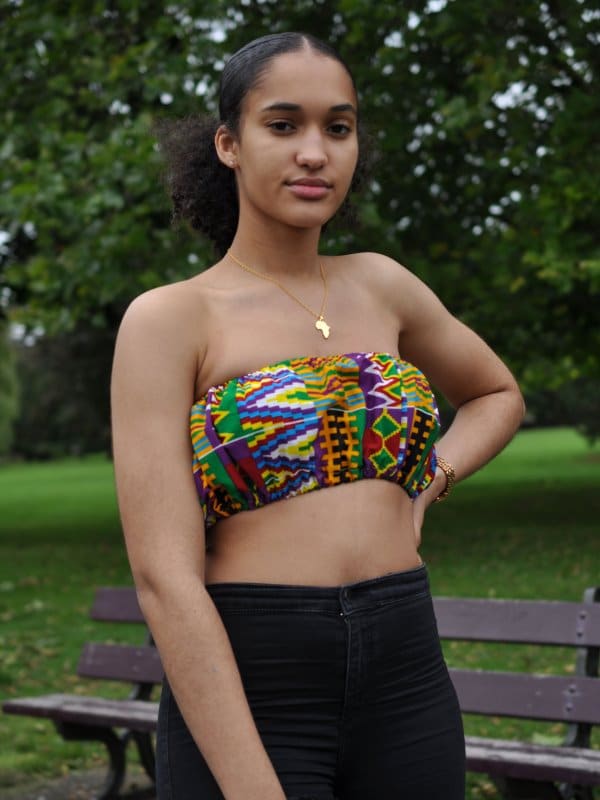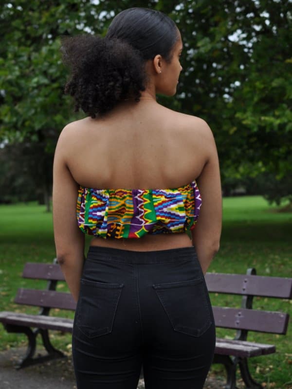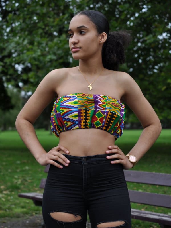 This colourful Kente African print bandeau crop top is a perfect match with a skirt or some shorts for the summertime. Pair with our pretty waistbeads and a necklace to accentuate the bright colours.