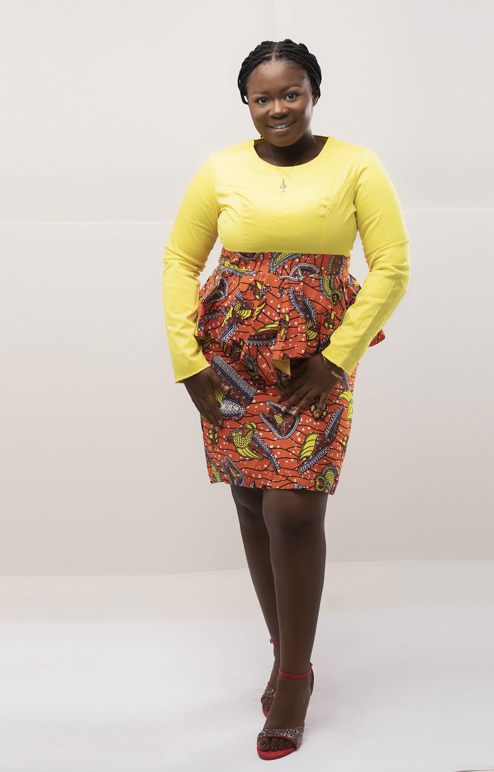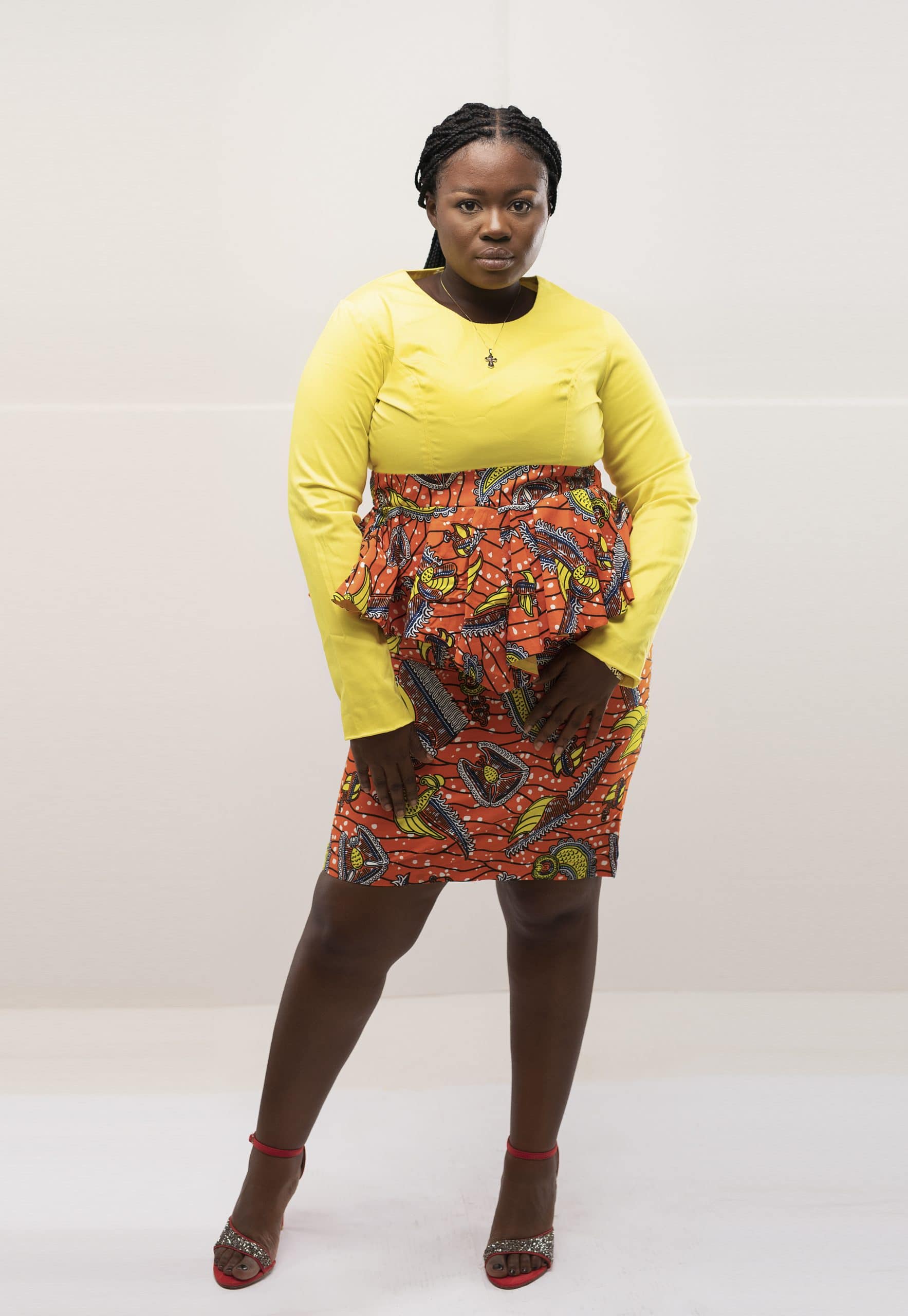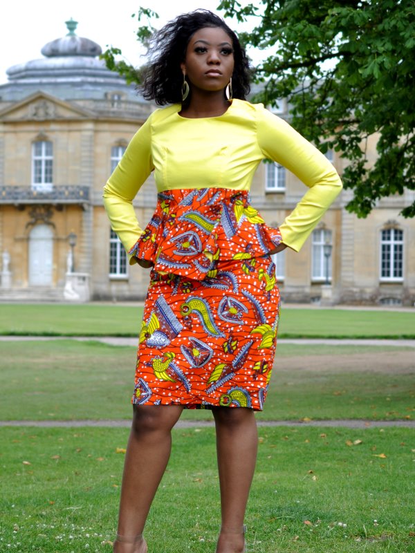 With bright yellow and orange tones and pretty African print, this Haniah two-piece skirt set with contrasting top is great for summer occasions.  Dress up with heels for an elegant look!