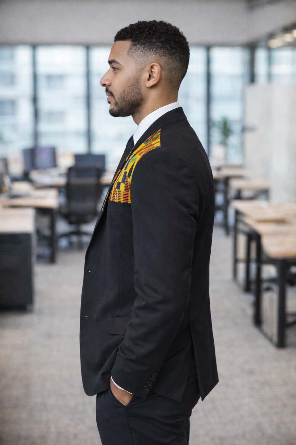 This jacket is easy to style for multiple occasions. Wear it with matching black trousers and a tie for formal or corporate settings. Pair it with tailored trousers or chinos for a smart-casual look. The subtle African print detail makes it suitable for both professional environments and cultural events.