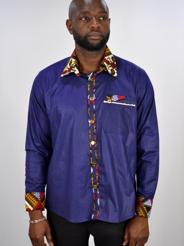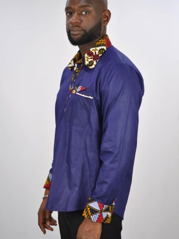 From our range of smart casual/business wear is this versatile black shirt made from polished cotton. This unique shirt is embellished, with a mixed print design made from Ankara cloth, on the pocket, Around the cuffs,inside the collar and down the button line to add a touch of Kente. Perfect for when you need something appropriate for work that has a touch of African print!They are perfect for any smart casual event such as work or a relaxed top. Makes the perfect first piece of african clothing for the wardrobe!