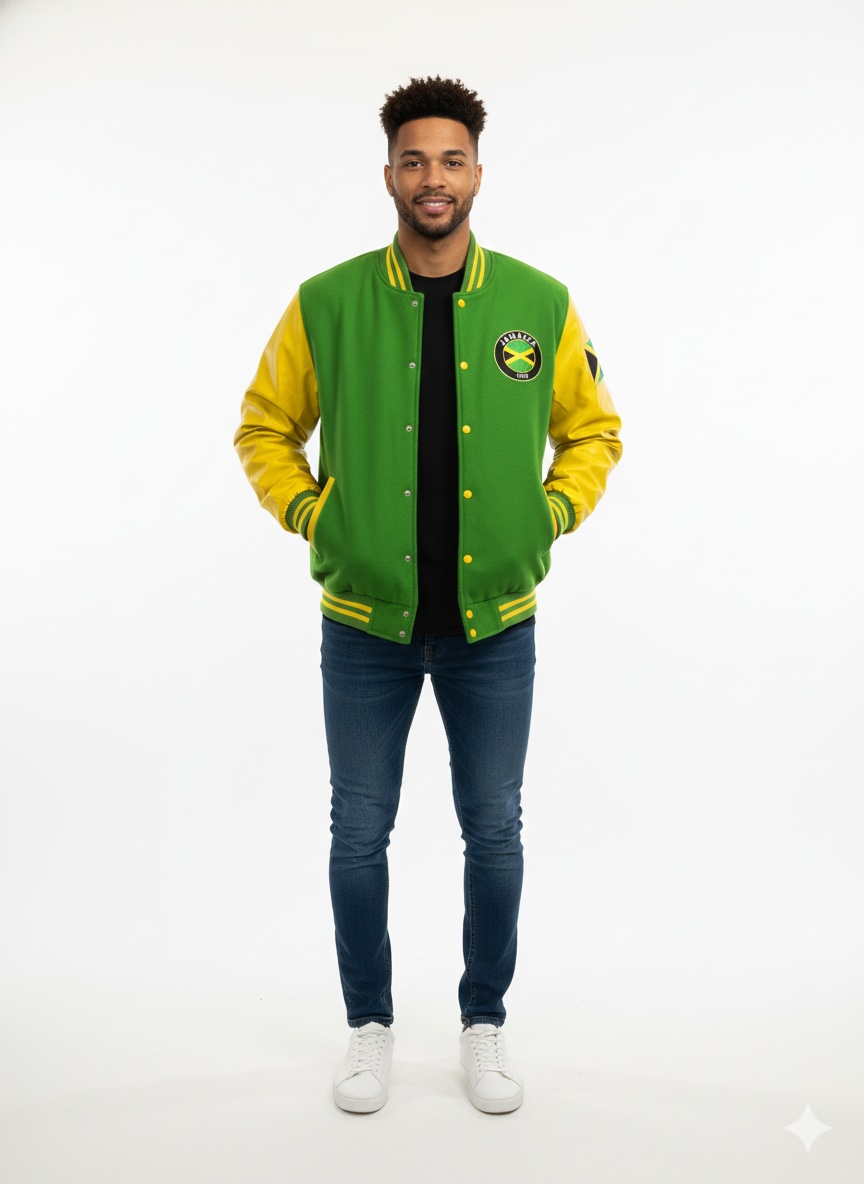 Stay warm, stylish, and confident with this Jamaica Varsity Jacket. It is bold, iconic, and very easy to wear. Because of its varsity style, the jacket stands out and adds identity to any outfit. It features the Jamaican flag colours—black, green, and gold—along with detailed embroidered patches. As a result, every piece carries a strong cultural statement. The premium stitching also gives it a high-quality and polished feel.