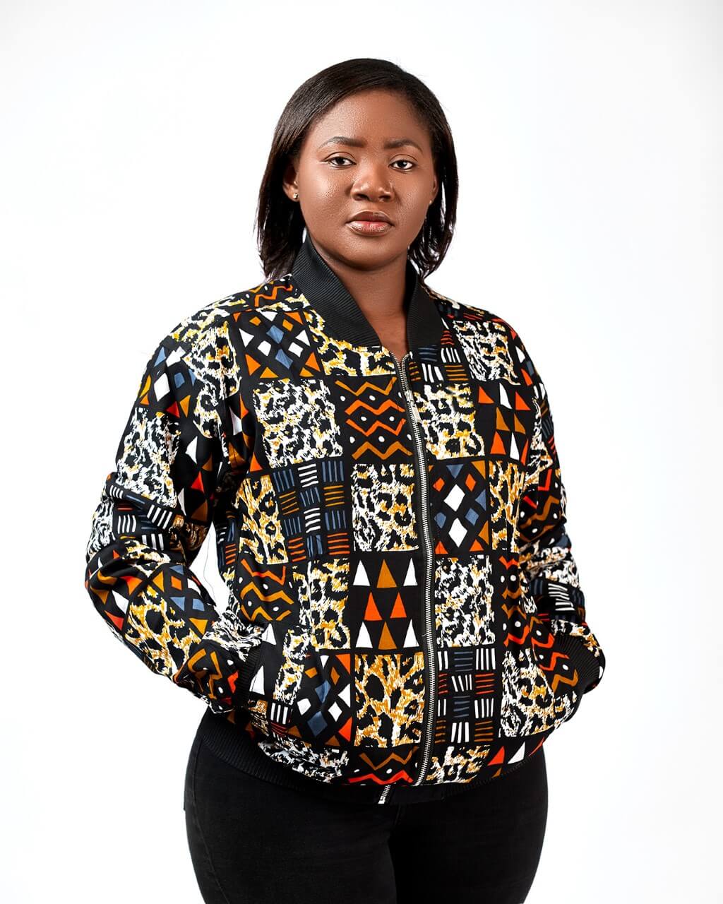 Brighten up your look with our unisex Kitoko African Kente Print Bomber Jacket with patchwork pattern. Perfect for any occasion or everyday wear. Insulated with a cosy lining and two pockets to keep you warm in the cold weather.