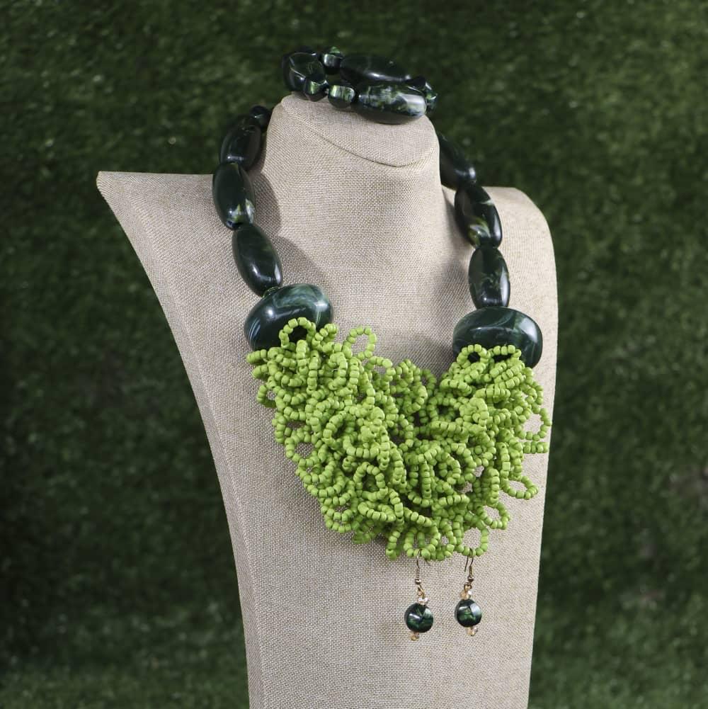 This beautiful HANDMADE Lime Green Acrylic Beaded Necklace goes perfectly complement any outfit.It has a beautiful beaded pattern with a unique piece in the centre that will sit beautifully and comfortably around the neck and adds a unique look to any outfit