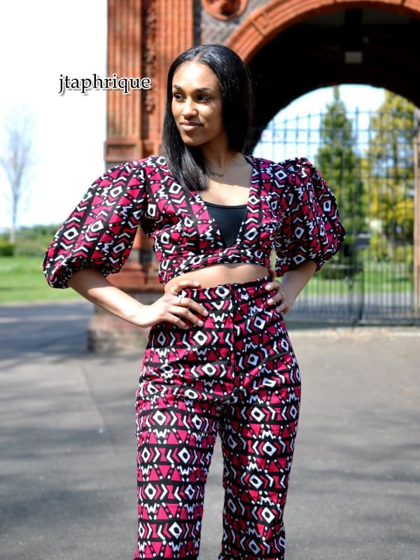 - Main colour: red / dark pink & multi-coloured Ankara print
