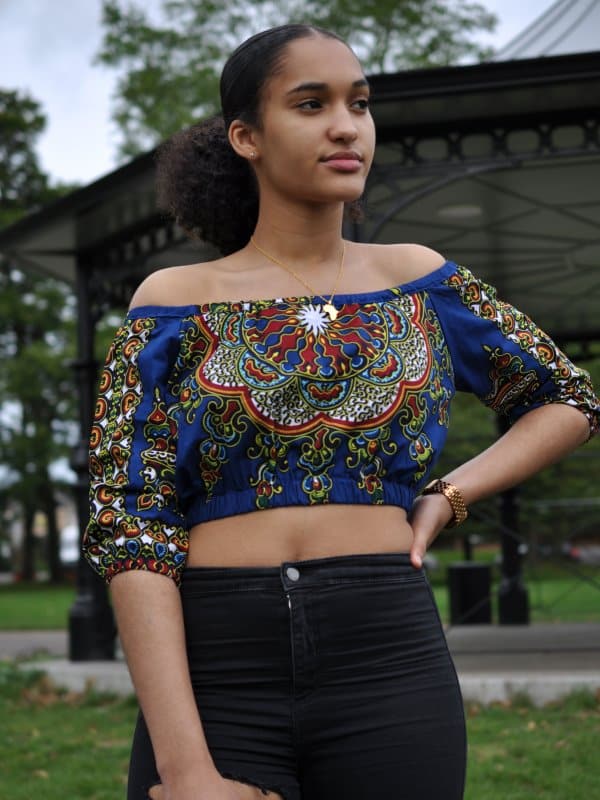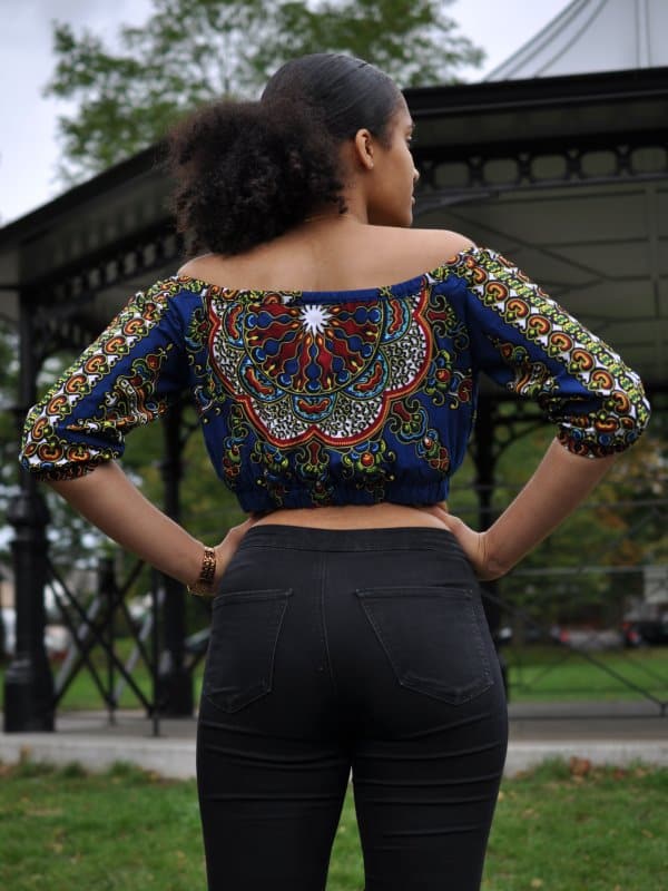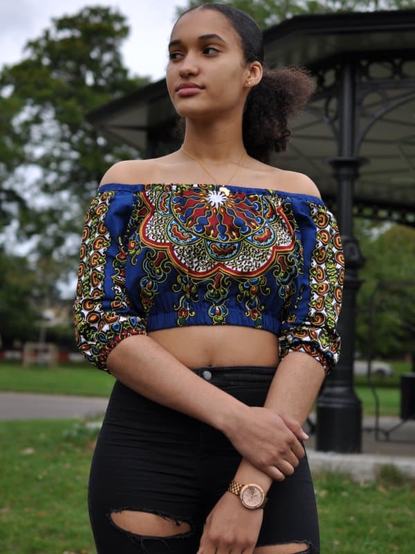 Showcase your figure with this gorgeous blue African print off shoulder crop top. Made from lightweight cotton-feel fabric, it is perfect for summer. Add a gorgeous neckpiece from our jewellery collection for a sophisticated, elegant look or if you are going for something more casual, simply pair with jeans or a denim skirt.