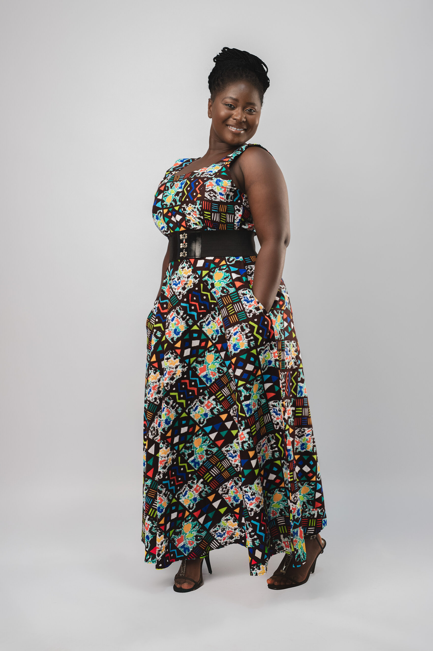 Introducing our exquisite Mchumba Multi Pattern Ankara Dress. This is a captivating and elegant masterpiece that beautifully fuses traditional African prints with modern fashion trends. Furthermore, the dress features a striking A-line silhouette that gracefully flows from the waist, creating a flattering and feminine look.