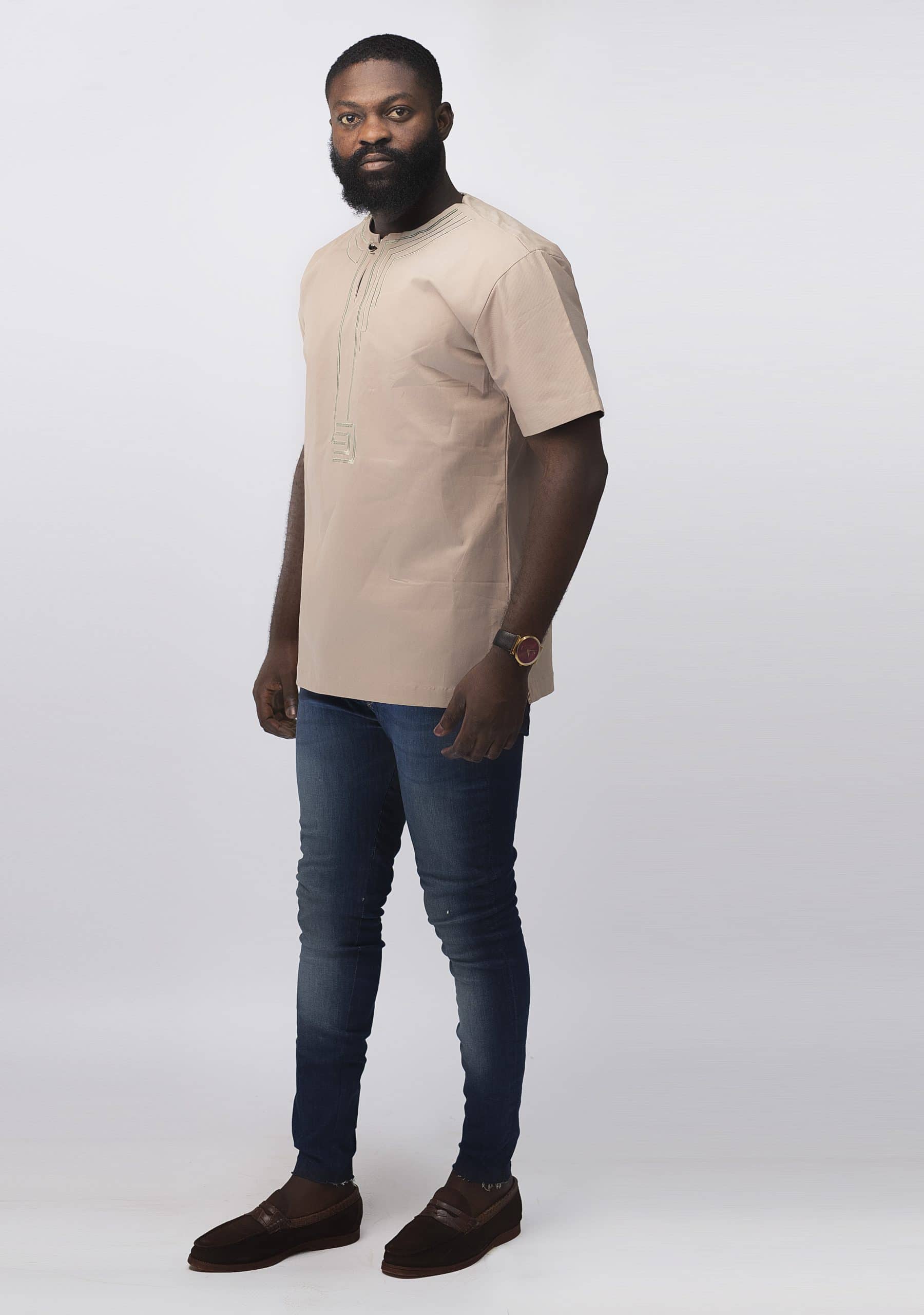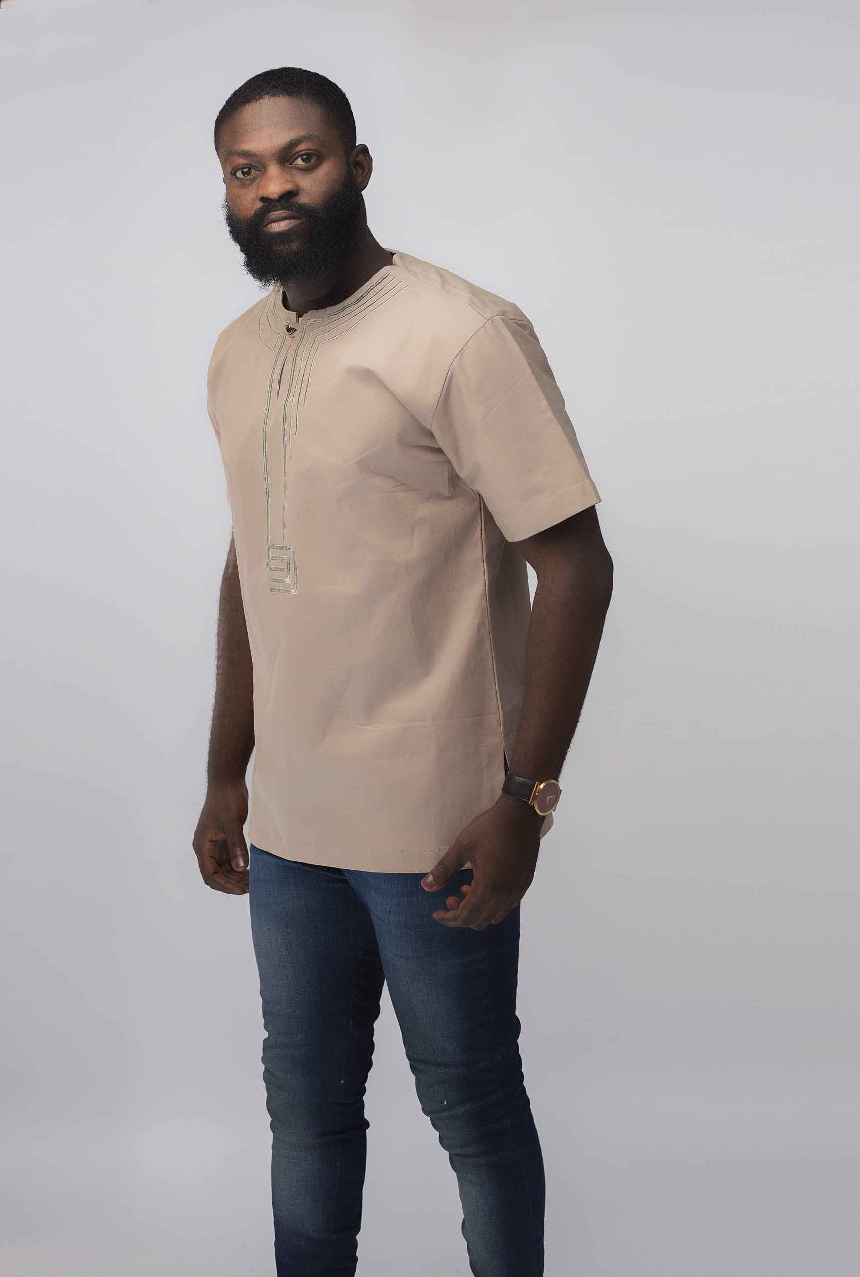 Looking for a smart embroidery shirt that is also affordable? Then this Modupe Slim Fit Embroidered African Shirt is perfect. This beige cotton shirt features a simple attractive embroidery pattern around the neckline and down the chest to give you a classic look. It also has a slim fit design so it fit snugly to the body. The added bonus is that we can custom make this shirt to fit you perfectly! Just give us your measurements with your order (please see below for details).