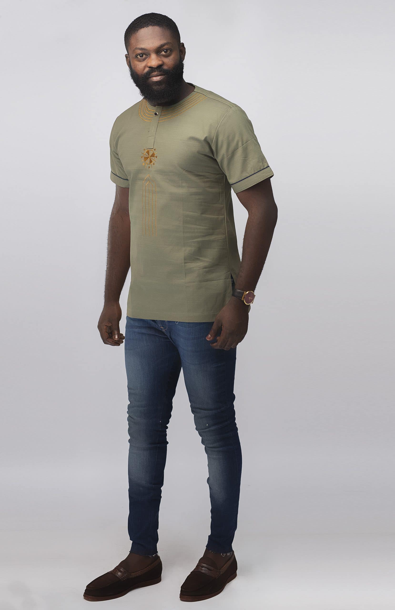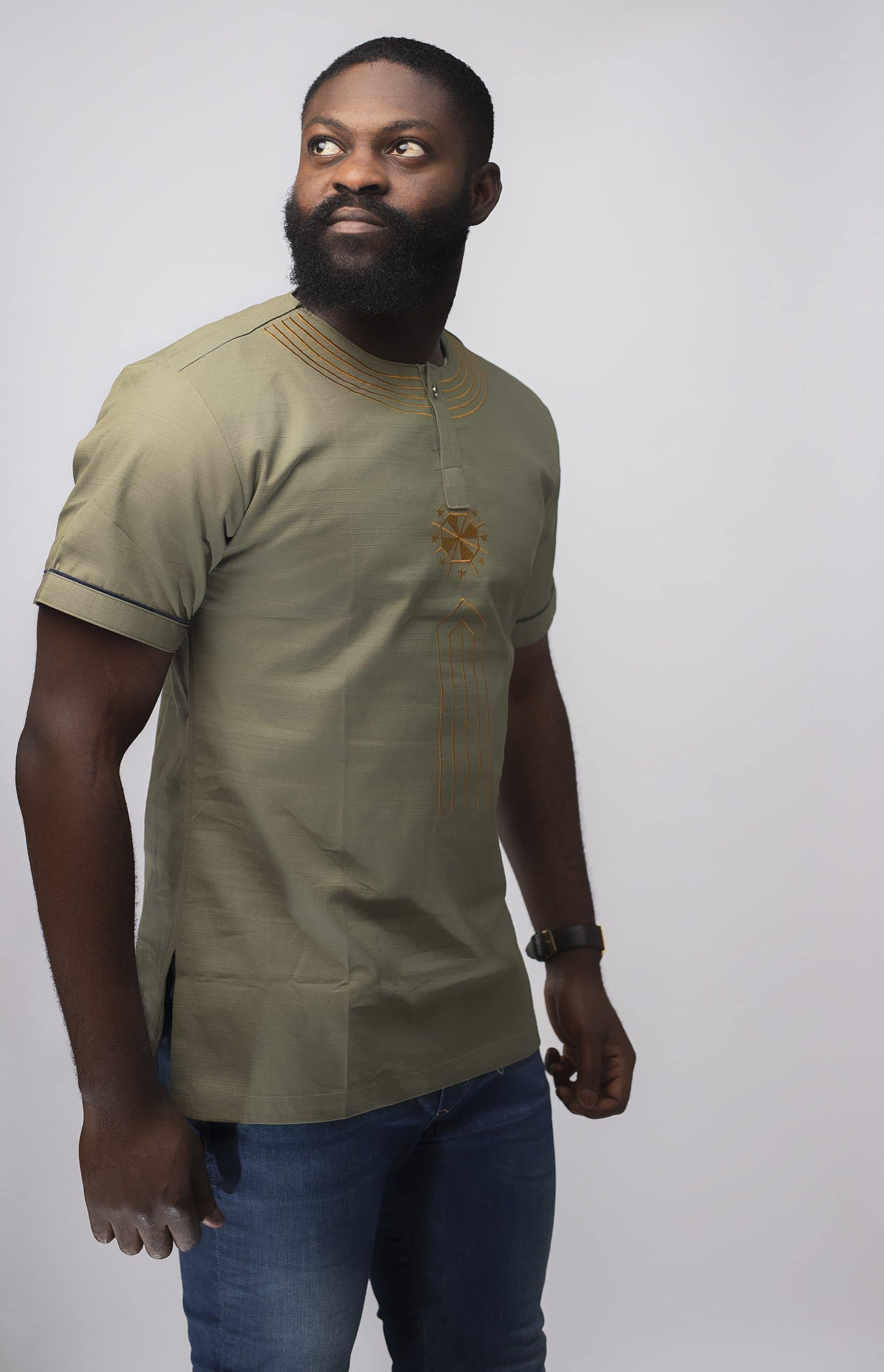 Looking for a smart embroidery shirt that is also affordable? Then this Momar Slim Fit Embroidered African Shirt is perfect. This khaki cotton shirt features an abstract minimalistic gold embroidery pattern around the neckline, down the chest and also black embroidery around the sleeves to give you a magnificent look. It also has a slim fit design so it fit snugly to the body. The added bonus is that we can custom make this shirt to fit you perfectly! Just give us your measurements with your order (please see below for details).