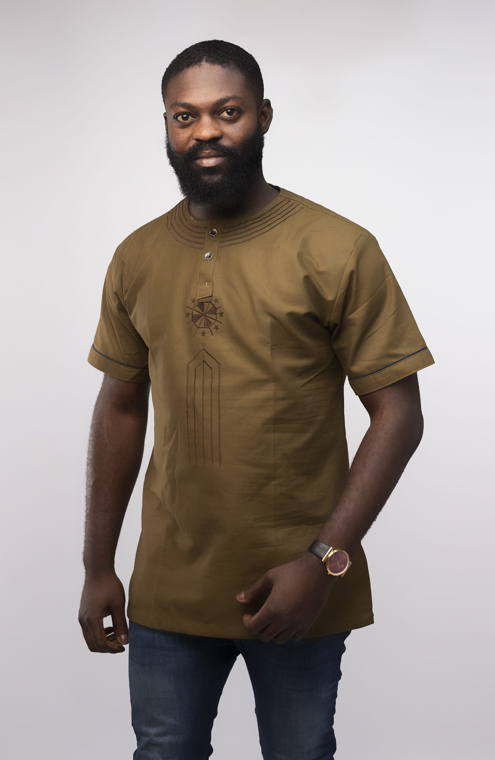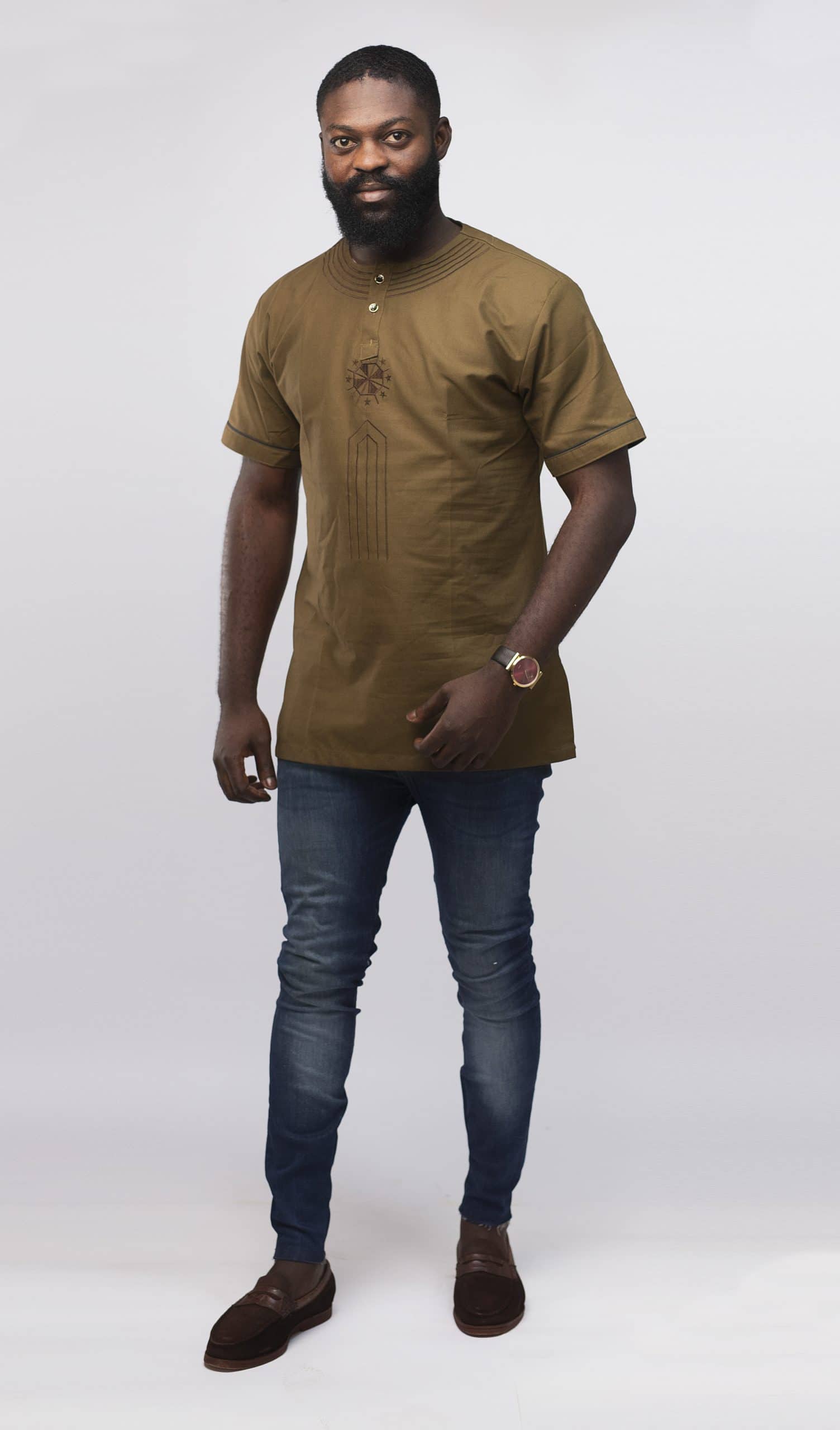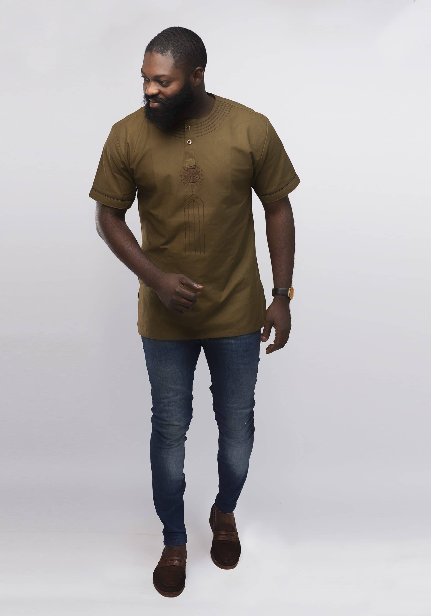 Looking for a premium quality embroidery shirt that is also affordable? Then this Morathi Slim Fit Embroidered African Shirt is perfect. This brown shirt features embroidery across the front and sleeves for a touch of elegance. With a slim fit design, this shirt fits snugly to the body for a fitted look.
