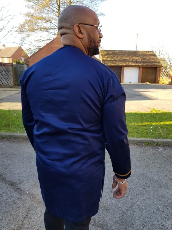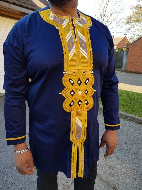 This attractive men’s navy blue and gold African embroidered longline shirt is perfect for occasion wear. With striking gold embroidery, this special occasion shirt gives you a royal look so it is ideal for a wedding, formal function, party or traditional event.