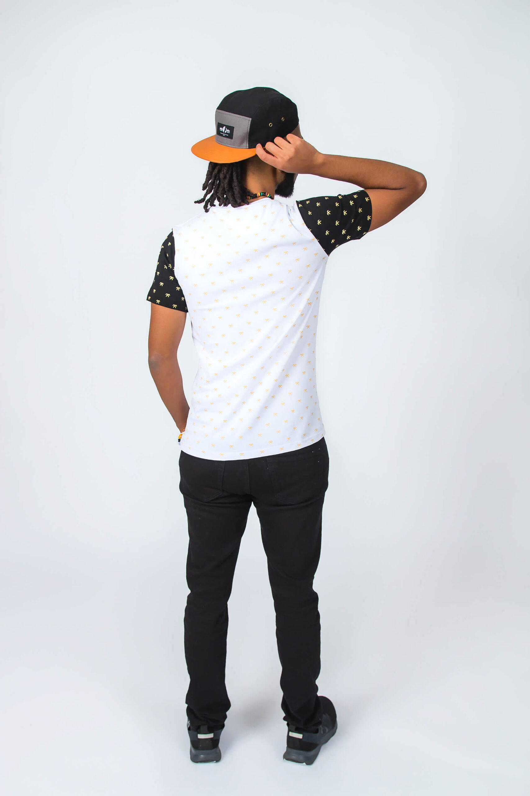 In addition, custom-made gold stitching, adorns the left side bottom of the garment. Here, the Origin & Tribe Logo shines with charm, elegantly sewn to the edge, while a center curved tag label adds a final touch of finesse.