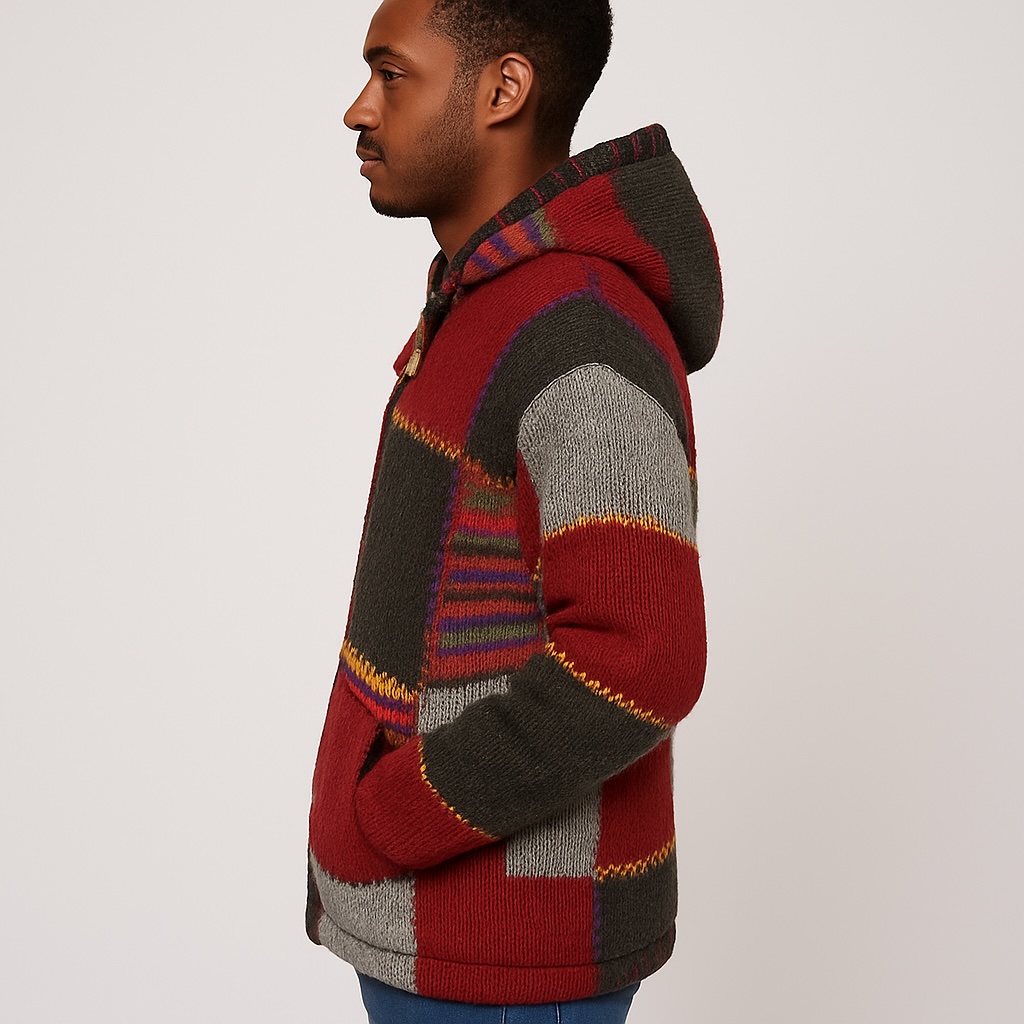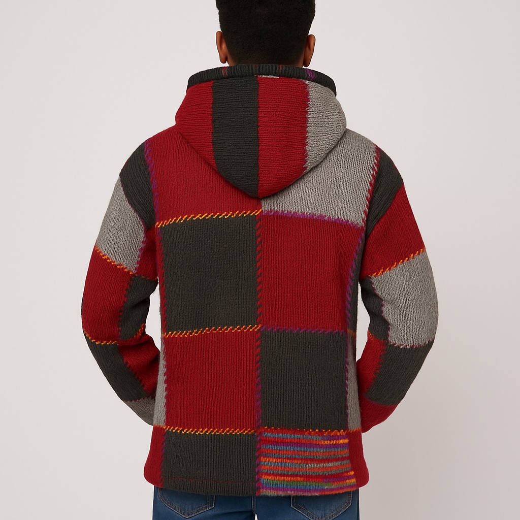 Stay warm and comfortable with this Patchwork Knit Hoodie Jacket. It is bright, colourful, and very easy to wear. Because of its patchwork style, the jacket stands out and adds personality to any outfit. It mixes deep red, charcoal, grey, and rainbow tones. As a result, every piece looks unique. The colourful stitching also gives it a handmade and creative feel.