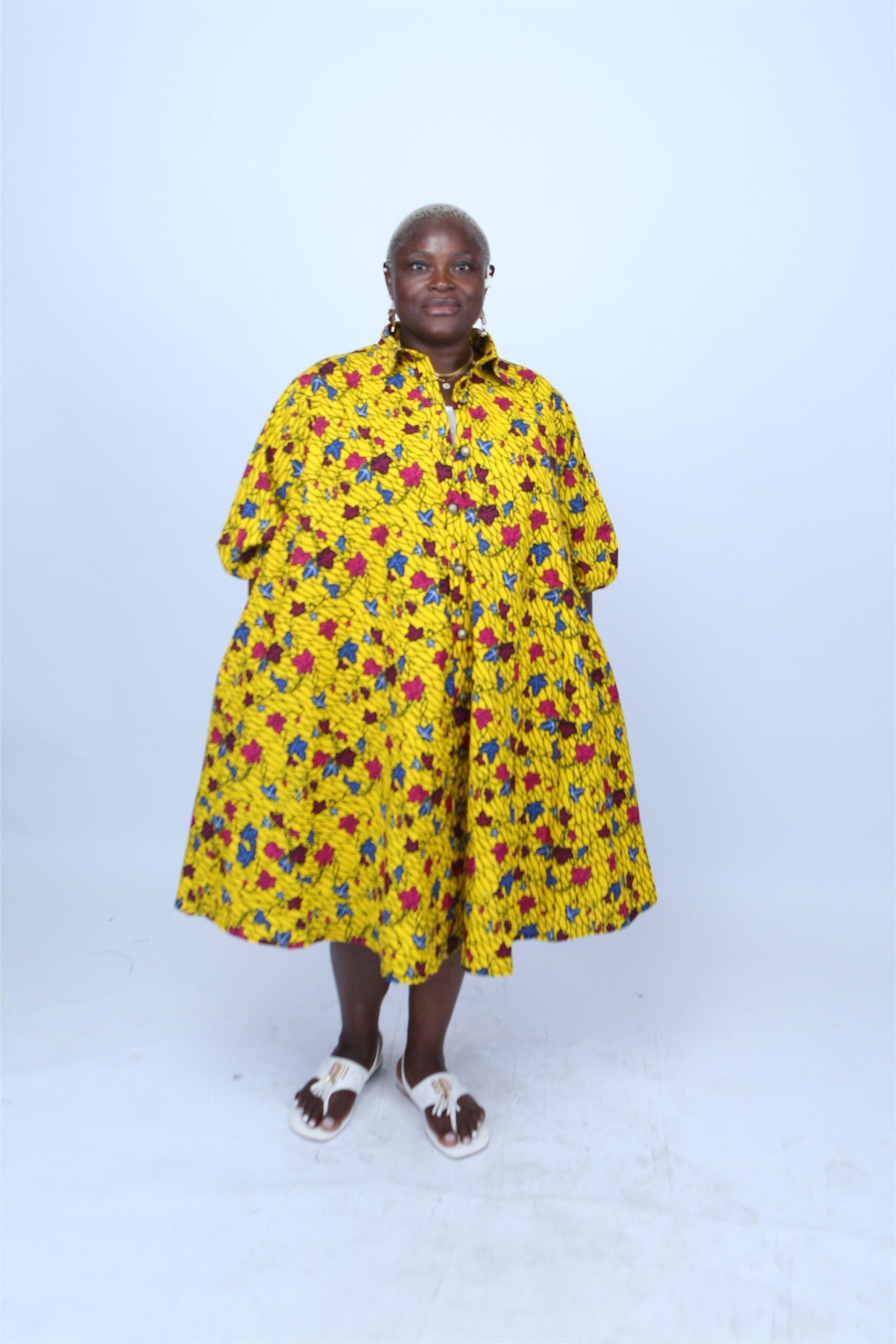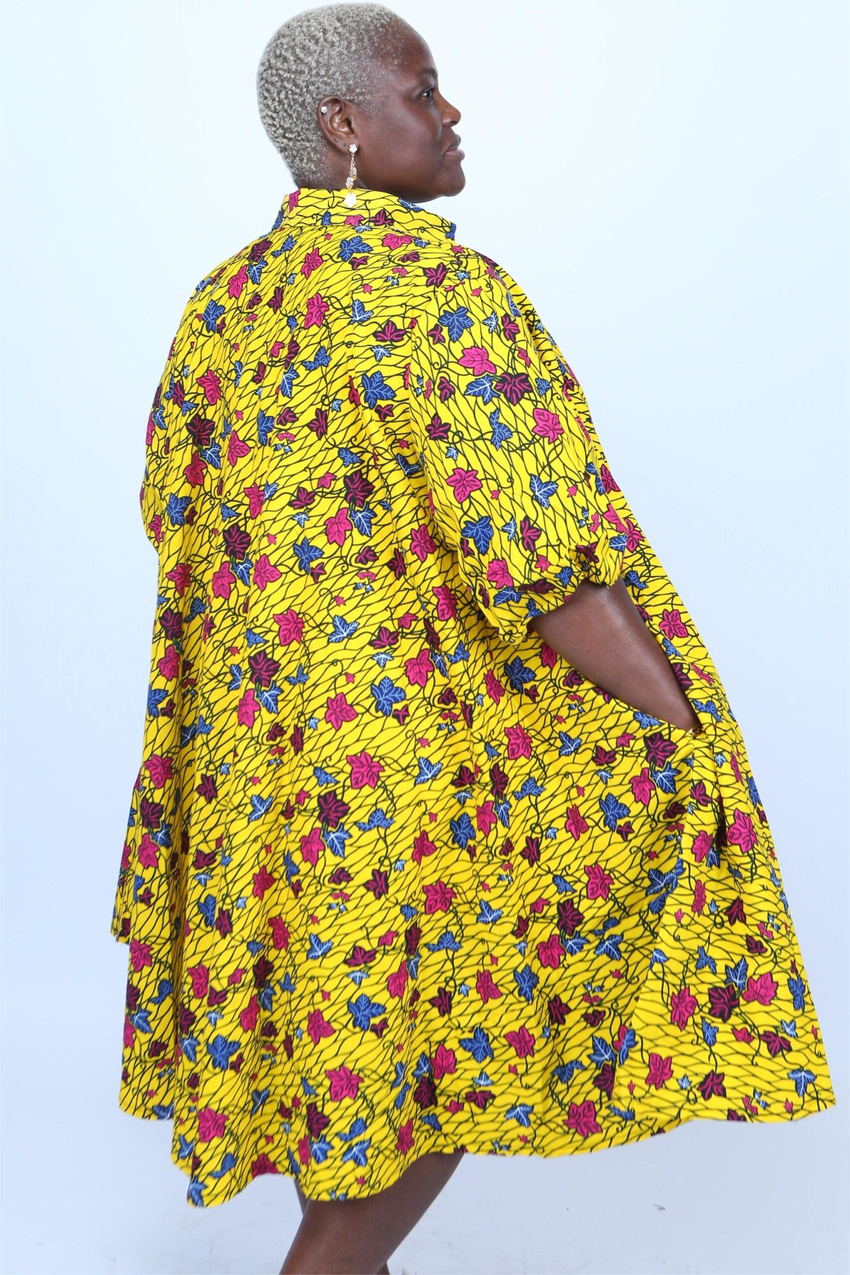 Our Yellow African Shirt Dress is a colourful and bold pattern that is guaranteed to make you stand out from the crowd. Its elbow length sleeves make for a practical design, whilst the knee length and breathable fit allows you to freely move around and feel like a queen. Additionally, the collar style adds elegance, and a touch of formality. The dress comes with buttons, adding practicality and ease of dressing. Finally, it can be dressed up or down and can be styled with a belt or accessories. We would recommend an orange bead necklace.