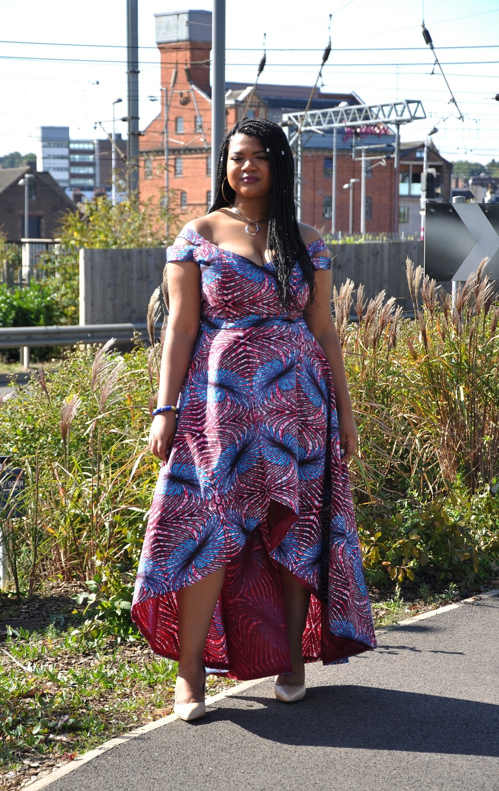 This gorgeous red and blue African print dress features a feather Ankara pattern and a high-low design. The off shoulder neckline and flared hem gives this dress elegance and beauty.
