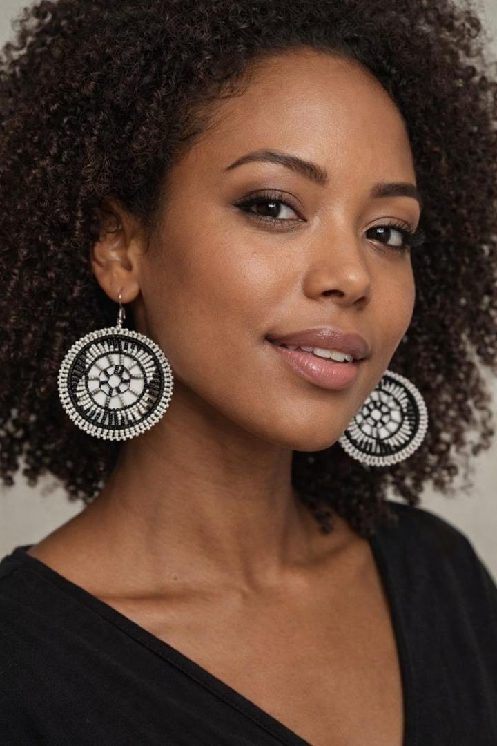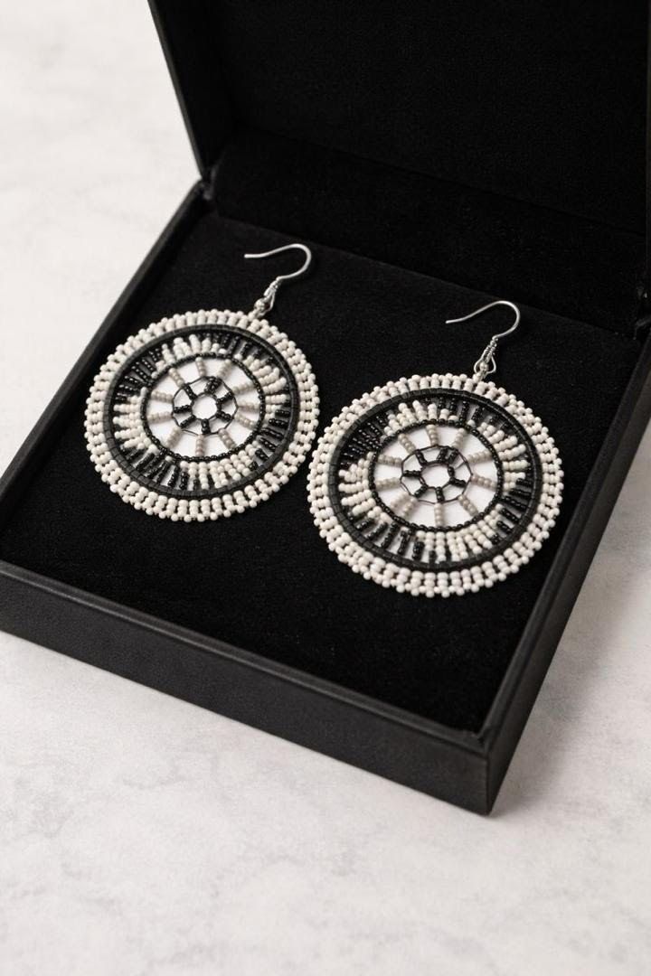 Each pair is a unique work of art, with contrasting black and white beads woven into intricate radial designs that create a bold yet sophisticated look. The layered circular motif reflects harmony, balance, and the rich heritage of traditional African beadwork.