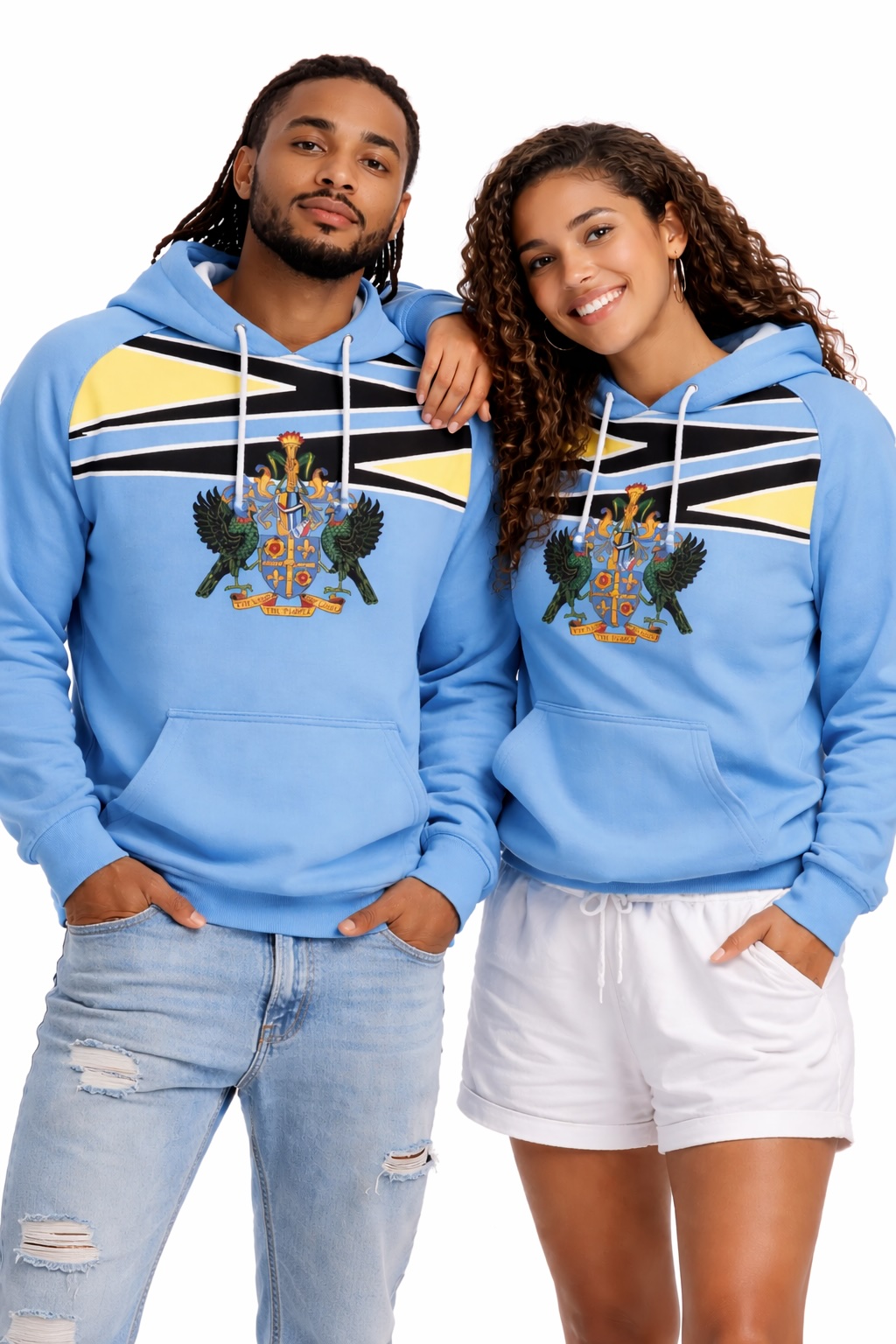 Make a confident cultural statement with this Saint Lucia Flag Embroidered Hoodie, a standout piece designed to blend heritage-inspired design with everyday comfort. Crafted for those who value both style and meaning, this hoodie features a rich colour palette inspired by the Saint Lucian flag, combining a bold base tone with contrasting accents that reflect the island’s national identity. At the centre, a finely embroidered crest-style emblem draws on Saint Lucia’s symbolism, celebrating its culture, history, and Caribbean pride in a refined yet eye-catching way.