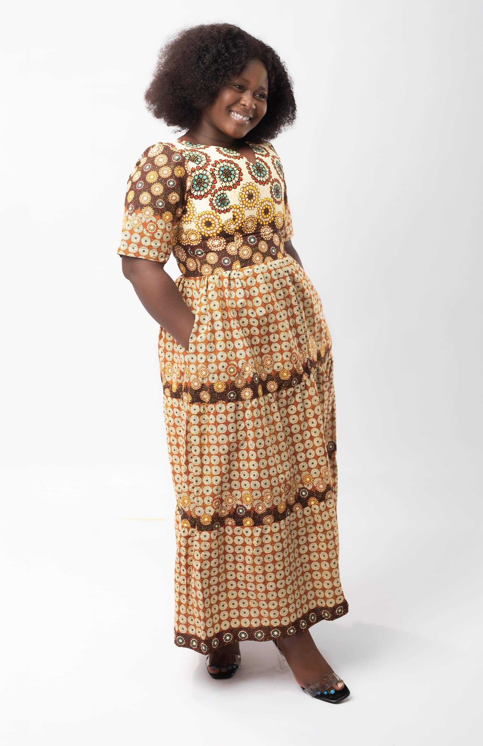 Step into the world of the Tawny V-Neck Ankara Patterned African Dress and immerse yourself in the warm, earthy hues of Africa.