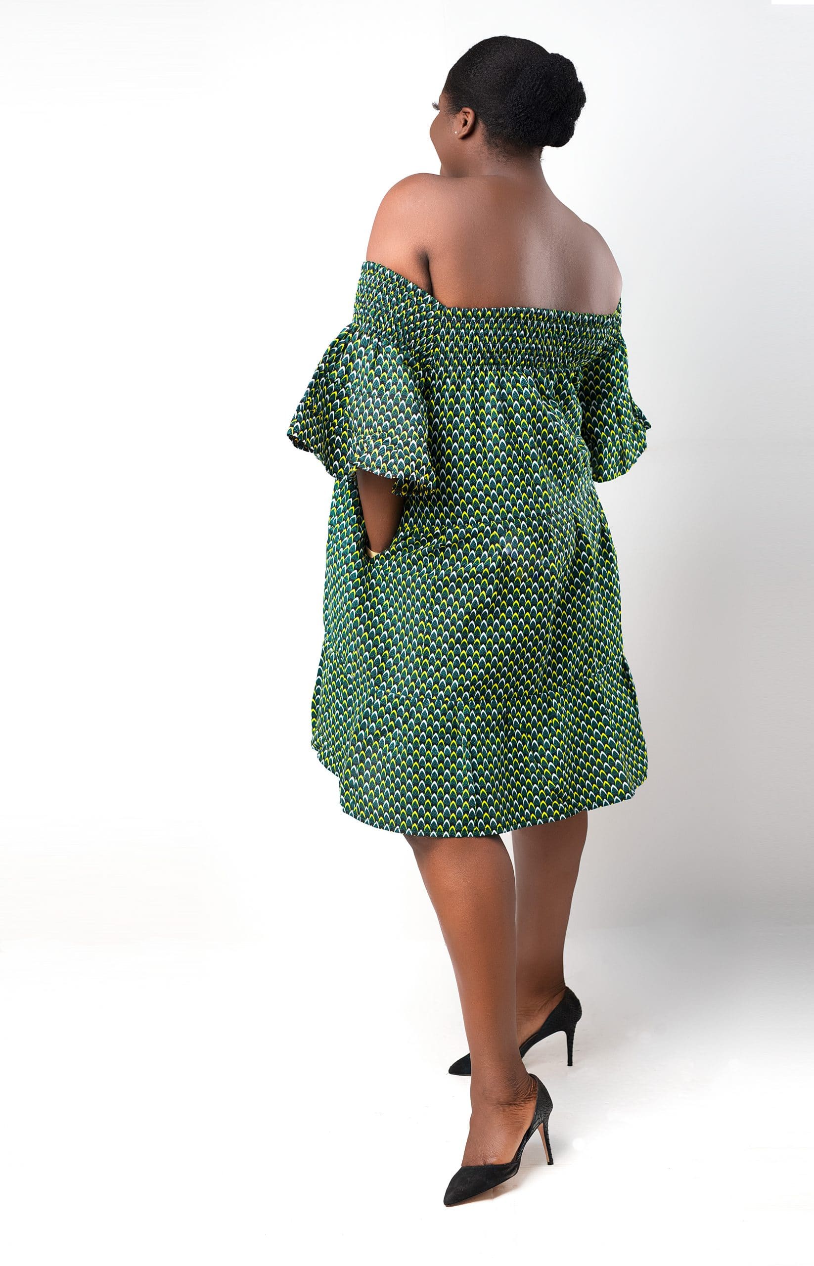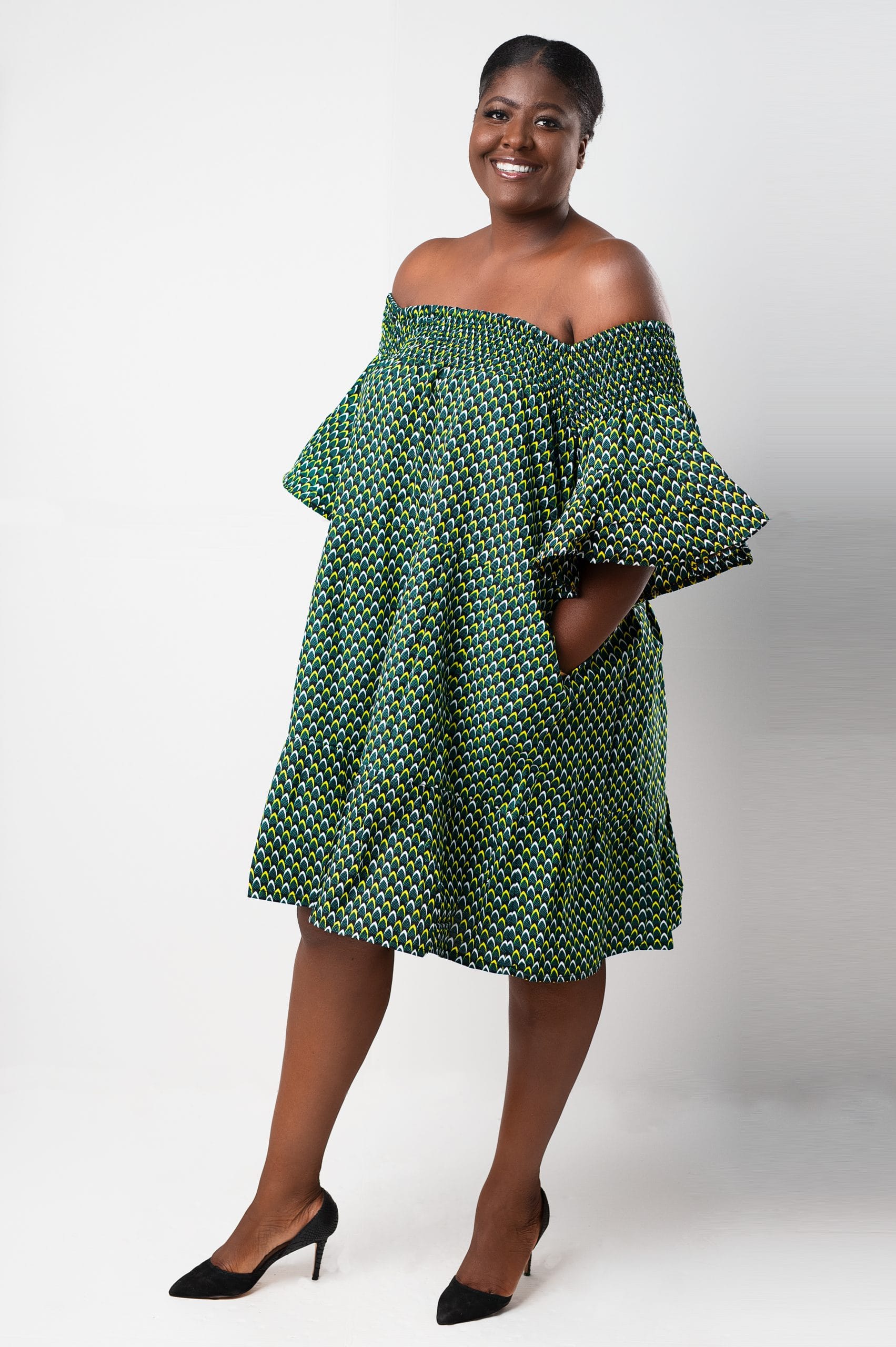 This Thando Green African Ankara Print Bardot Midi Maxi Dress is perfect for any event.It has a comfortable elasticated Bardot fit with short wide sleeves.It also has a midi length maxi fit which makes it suitable for wide range of occasions and be dressed either up or down with heels and a nice bag or sandals.It also features pockets for convenience.