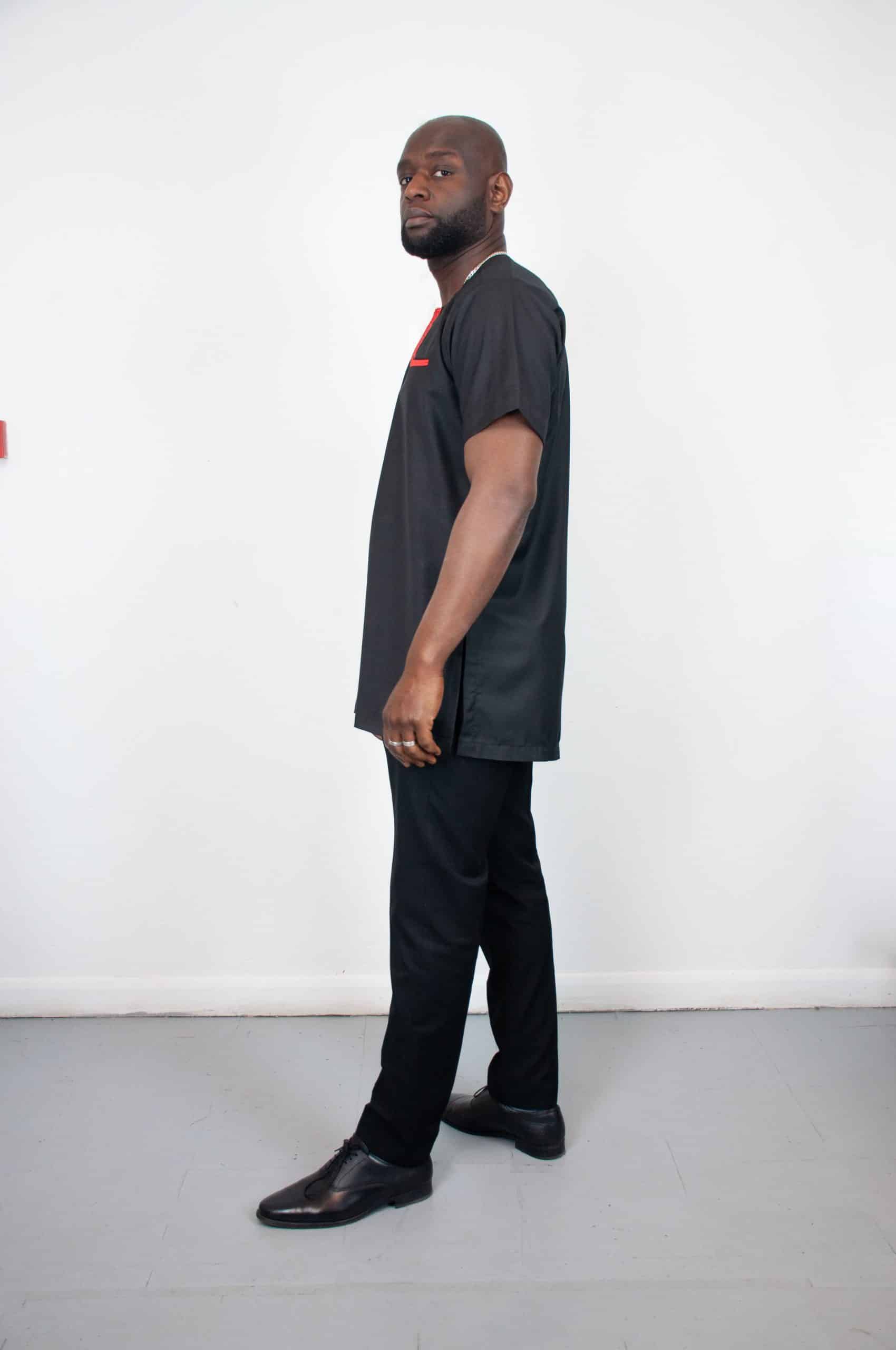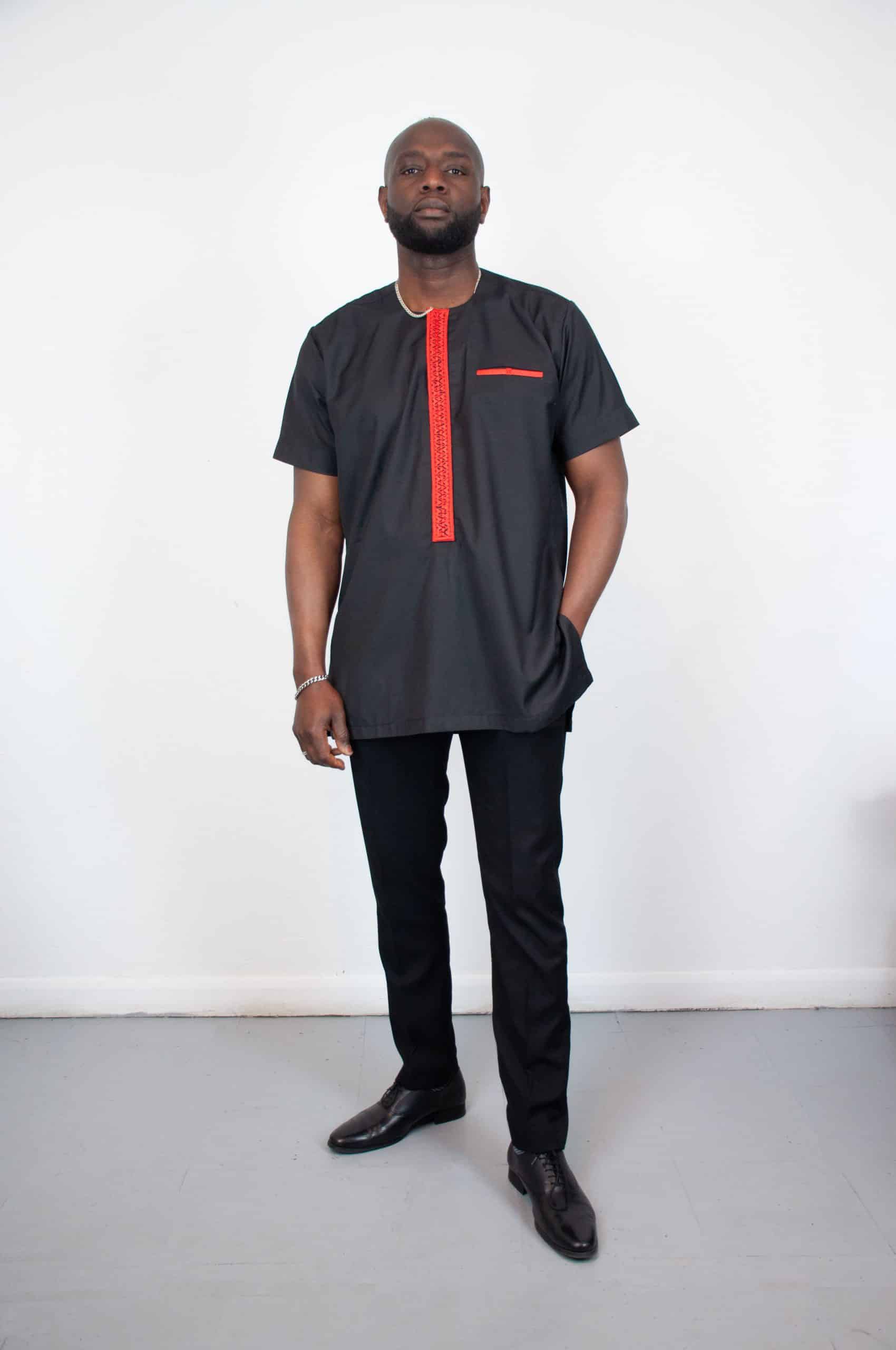 Our Wanja Black Traditional Suit is a traditional African suit design. Featuring a shirt, with a classic collar, and red embellishment on the front, and matching trousers. The trousers have a comfortable, regular fit and are designed to match the shirt perfectly.