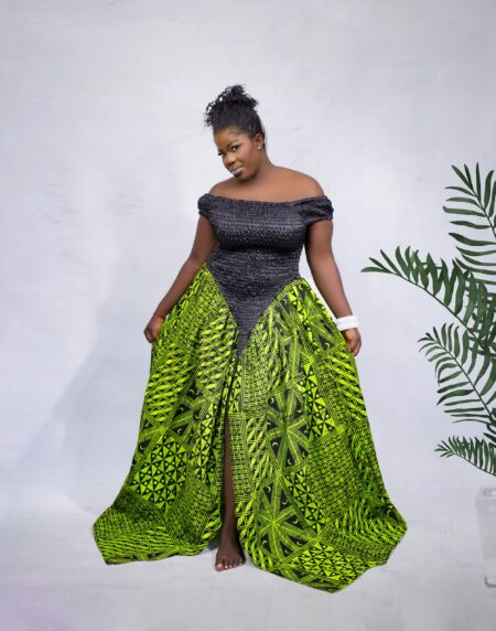 Elegant African print off-shoulder maxi gown with a front slit. Bold, feminine, and perfect for weddings, galas, or cultural celebrations.