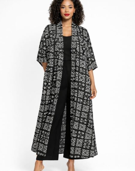 African print longline kimono jacket with a flowy silhouette and bold patterns, perfect for layering and adding cultural elegance to any outfit.