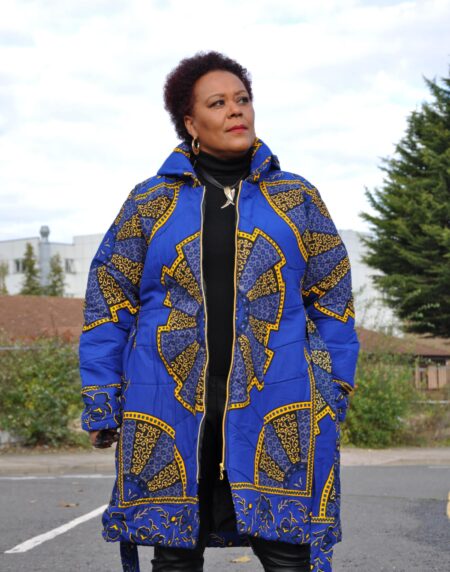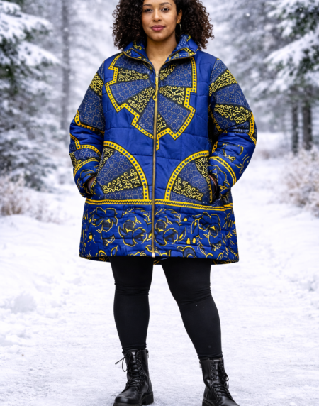 This gorgeous ladies blue and gold Akufo African print (Ankara) puffer coat is great for winter! A perfect blend of style and comfort, this coat has plenty of warmth.