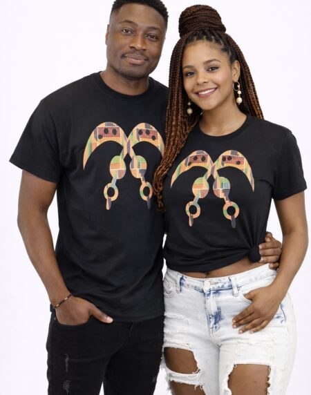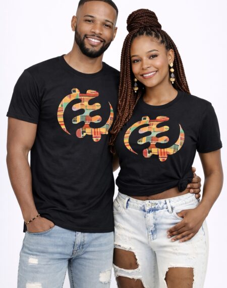 Treat yourselves with these stylish, unisex, printed Kente design t-shirts featuring the symbol Gye Nyame / Adinkra. Ideal to wear with jeans