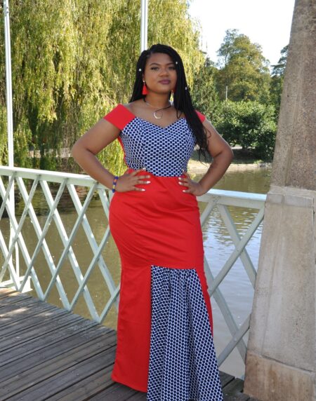This beautiful, elegant, red and African Ankara print bardot fusion dress is ideal for bridal wear, prom parties and other special occasions. With a fit and flare pleated design and striking Ankara checker pattern, this stunning dress is sure to turn heads.