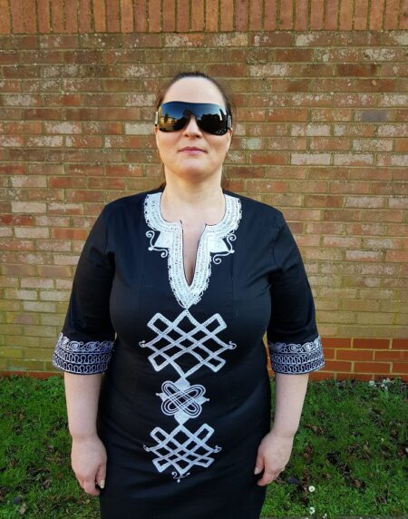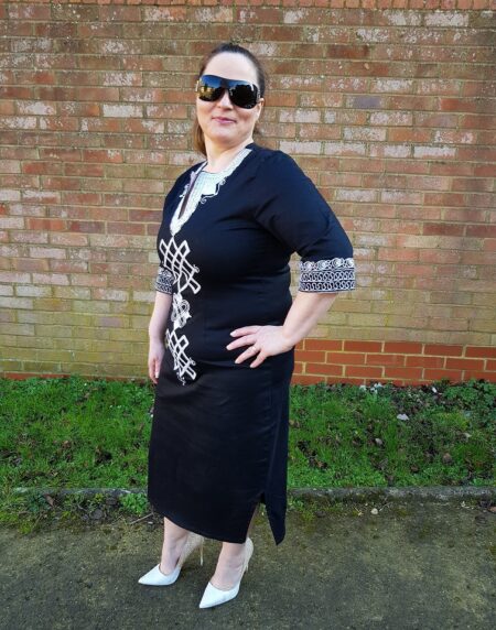 Make a statement with this one of a kind sheath dress! Featuring a slit neckline with striking embroidery detail, this shiny dress creates a lovely streamline shape. Made from luxury, polished Cotton, this dress creates a unique and extravagant look.FEATURES:Material: polished Cotton