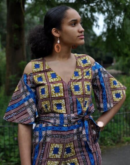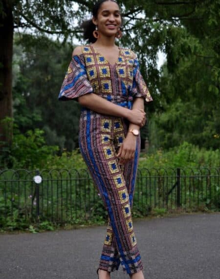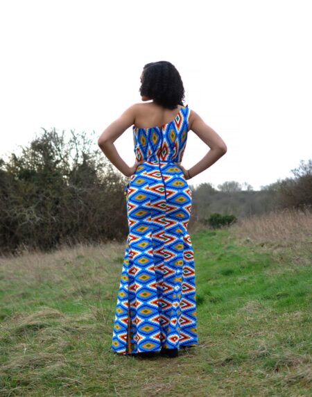 Going to a summer party? This stunning, blue & gold, cold shoulder, African print jumpsuit with butterfly sleeves is perfect for the summer season. Team it with nice jewellery, heels and a dark blue jacket for a sophisticated look, or with flats for a more casual, everyday vibe.Please note -