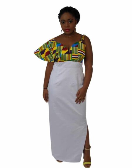 This beautiful Afro fusion dress features an asymmetrical design, a sweetheart neckline, one butterfly sleeve, a plaited strap and side slit. The African Kente print detail with contrasting white pencil skirt sets this dress apart.