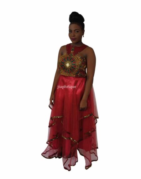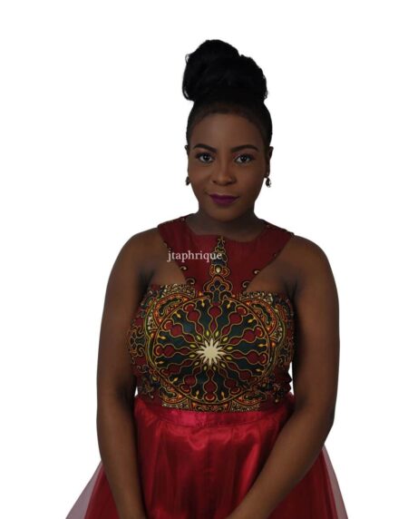 This stunning dress really sets the wearer apart from the crowd! Featuring a halter neck, Ankara print bodice, Tulle layered skirt and delicate gold Ankara print hem detail, this dress creates an elegant, classic look with an African twist. Perfect for that special occasion!