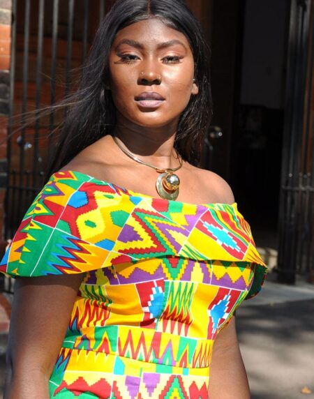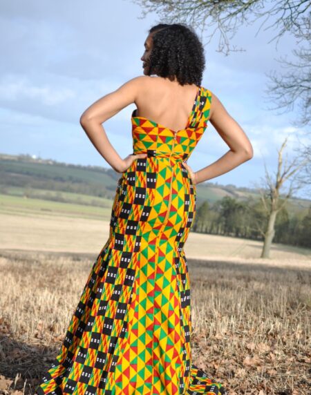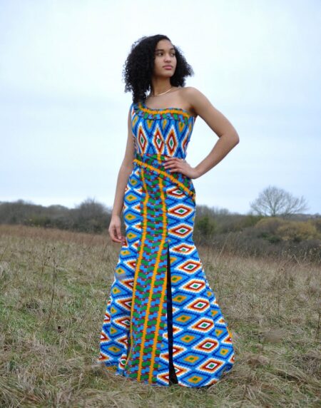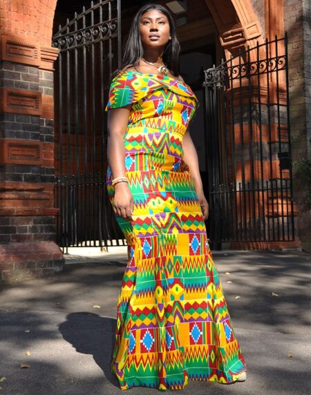 This stunning, floor-length, silhouette dress radiates elegance and sophistication! The striking blend of colours and patterns together with the Kente print makes it a perfect choice for evening wear, a prom, cocktail party, ball gown or any special occasion or event. Creates a lovely silhouette!