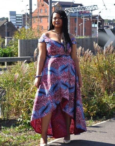This gorgeous red and blue African print dress features a feather Ankara pattern and a high-low design. The off shoulder neckline and flared hem gives this dress elegance and beauty.Please note - due to unforeseen circumstances we are unable to get the same fabric as pictured , please pick a