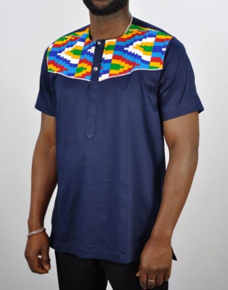 Navy Blue Polished Cotton & Kente Print shirt.