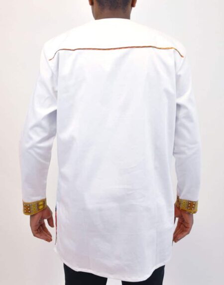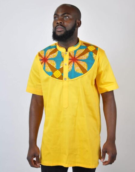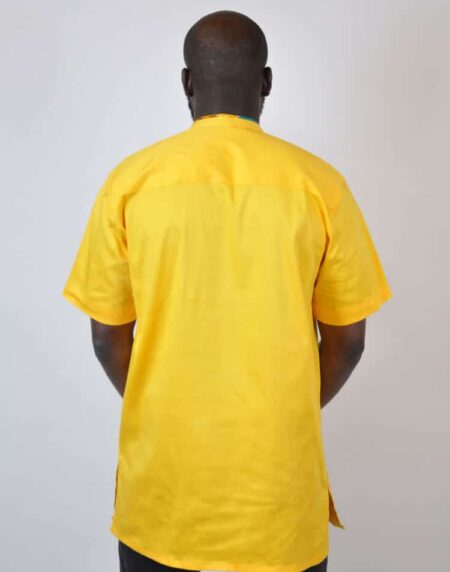 Yellow African Shirt with Multi-Colored Collar. Attractive African men`s wear fit for all occasions. This unique out fits make you stand out of the crowd. Compatible for both casual and event wear.FEATURESNeckline chines