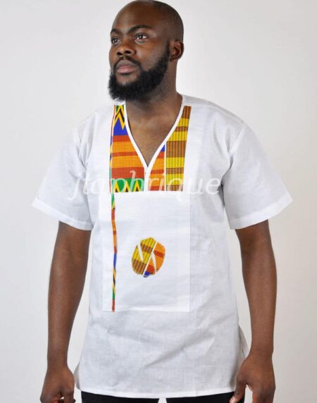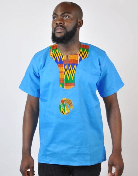 This shirt is a stylish fusion of linen and traditional Ghanaian Kente, combining modern design with rich African heritage.