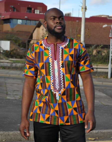 This is an immaculate and vibrant Kente Print Summer Shirt with embroidery detail on the neckline. Very stylish short sleeve shirt, perfect for elegant events as well as casual occasions. A very comfortable and versatile addition to your wardrobe.FEATURES:Main colours: Kente, yellow, green, blue & brown, multi-coloured