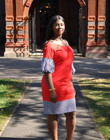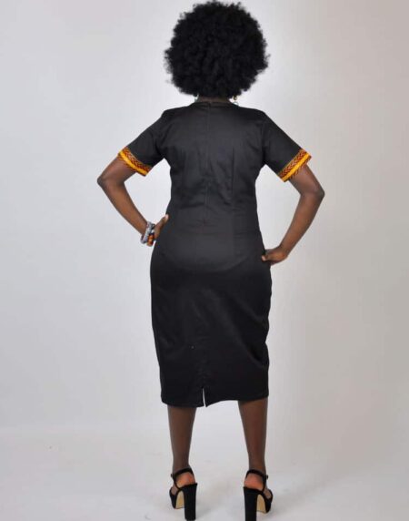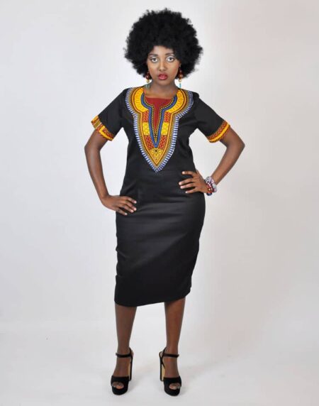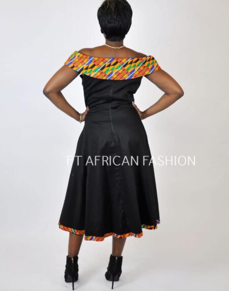 This beautiful black skater dress in polished Cotton with Kente print detail is perfect for evenings and special occasions. This 60s style dress is brought to life with off the shoulder Kente print which will stand out in any crowd.