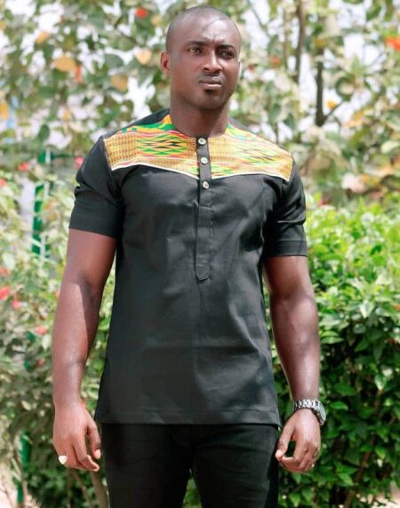 This shirt is perfect for your summer wardrobe. Made from black polished Cotton and showcasing a touch of Kente print on the neckline and front pocket. Great for everyday casual wear.